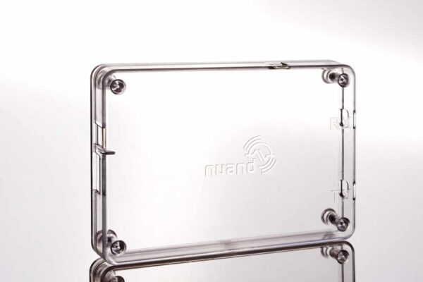 The bladeRF case features a screw fastened plastic injection molded case. The material is a high density yet clear PolyCarbonate material that can withstand a great amount of stress.