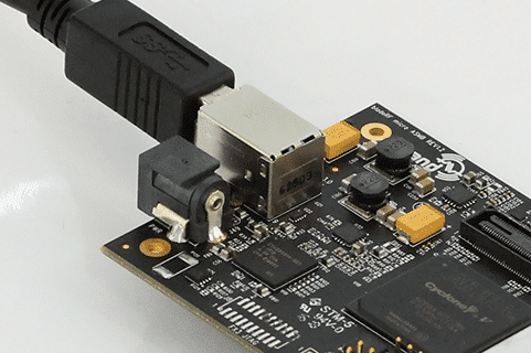 An Altera Cyclone V FPGA provides the interface between the FX3 and RF transceiver. This FPGA has single-cycle access embedded memory, hard 18×18 multipliers for dedicated DSP and many general logic elements ready to be programmed.