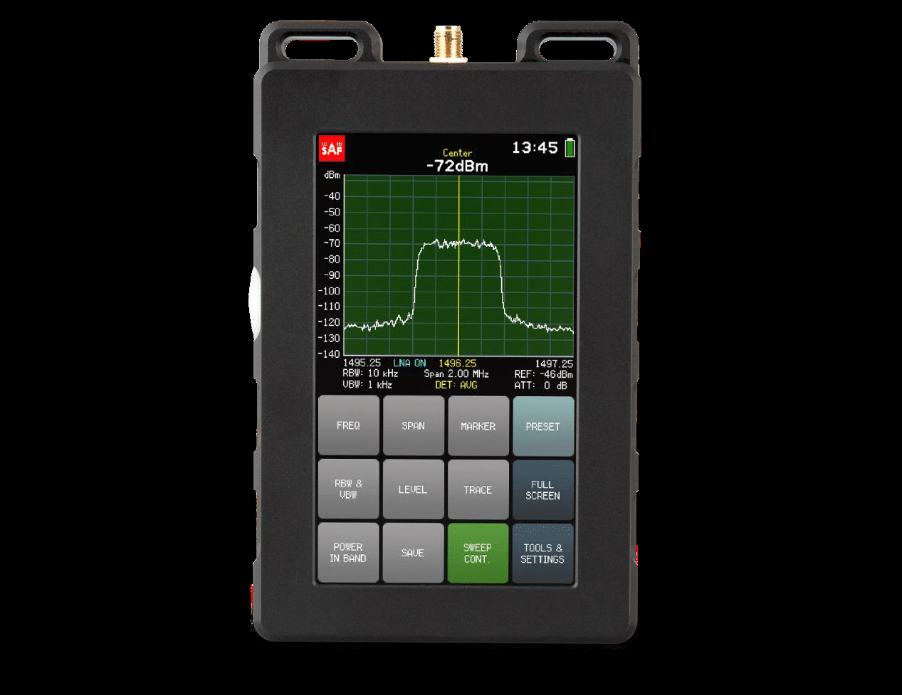 SAF Tehnika 3GHz Spectrum Analyser The SAF Tehnika 3GHz Spectrum Analyser covers the range 0.3-3GHz for field and lab use in a convenient hand-held format. Measurements Channel Power (measures the total power in a specified bandwidth) Adjacent channel power Signal bandwidth Center frequency Interference detection Mask Setup Parameters Frequency: Center/Start/Stop... Read More