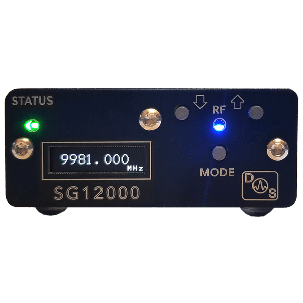 The DS Instruments SG12000L compact RF Signal Generator enables users to generate a high quality RF signal easily and at low cost. The output covers the entire 25 – 12000MHz frequency block. The produced wave is fully synthesized using modern fractional N synthesis. RF output step size varies from a maximum of ~6 KHz to less than 40 Hz, depending on band of operation. The synthesized source can accept an external 10 MHz reference, or it can use its own internal 10 MHz TCXO. Output power is calibrated between -25 and +13dBm, and can be set in 0.5dB steps over the entire frequency range. The crisp OLED display provides useful feedback for the user, and front control buttons provide a quick alternative to USB control. Optional Ethernet is now available, and full-band calibrated RF power control is standard. Like most of our products, the SG12000 easily fits in the palm of your hand, making it a truly portable and bench-space-saving device.