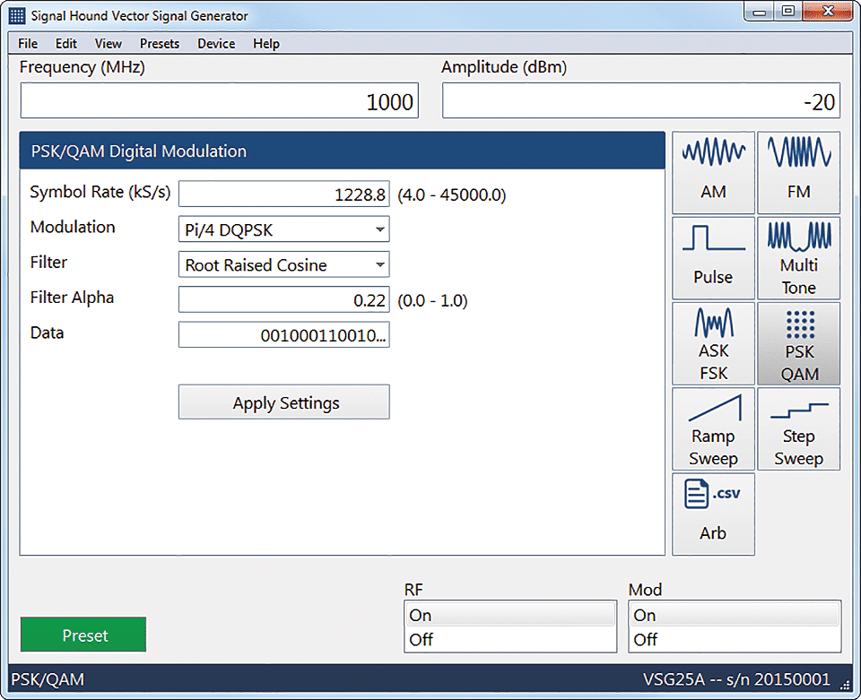 • Load a CSV file with I and Q values, specify center frequency, amplitude, pattern length (up to 2048), pattern period (up to 65535), and clock rate.