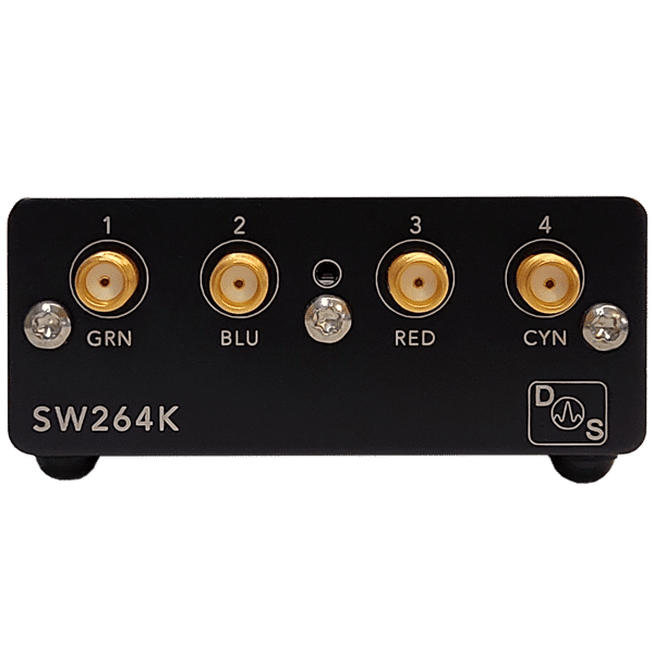 DS Instrument’s new SW264K 26GHz RF switch is a 4-Way solid-state RF switch is powered via USB and controlled using a rear pushbutton switch, or via SCPI commands over the virtual COM port. Status LEDs and audible feedback make this device extremely user friendly for stand-alone usage and remote scripted operation. This non-reflective ultra-wideband SP4T switch is perfect for X and Ku-band automated test setups. Fast switching time and an affordable price point make this the best low-power switch on the market today. No special drivers are needed to send serial commands from any operating system or host device.