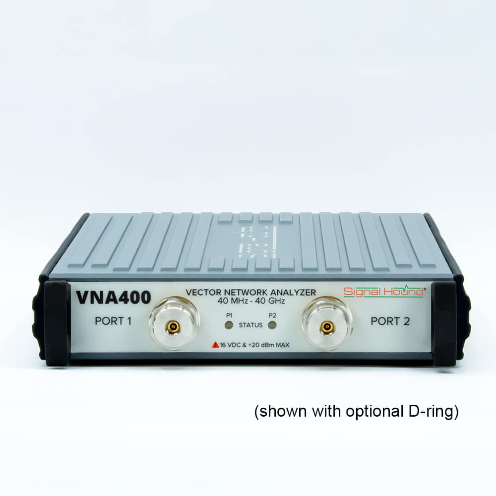 The VNA400 is a high-performance, USB-powered, 40 GHz, 2-port, vector network analyzer. It features a wide frequency range of 40 MHz to 40 GHz, sub-Hz resolution, +/- 1 ppm internal TCXO accuracy and a sweep speed of 2000 points per second at 30 kHz RBW. A fully-featured software suite is included with this product.