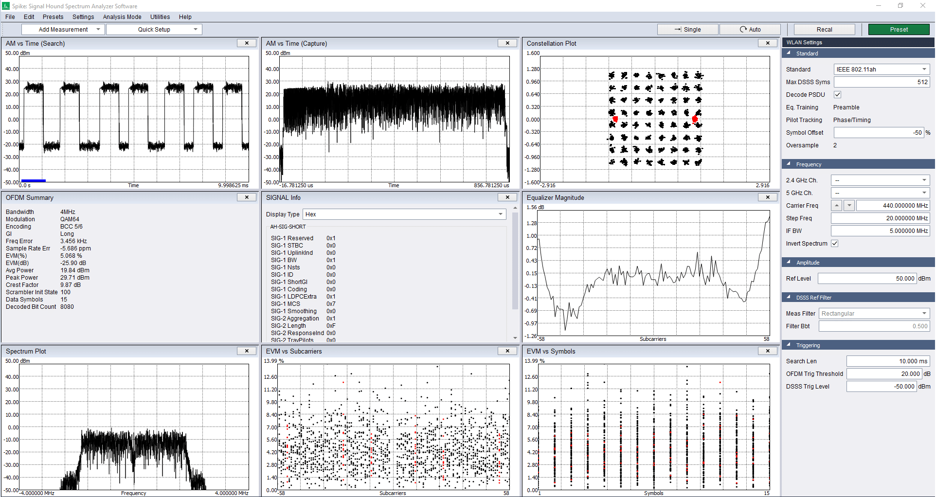 Signal Hound WLAN AH Measurements Toolkit Spike™ includes specialized WLAN modulation analysis features, allowing physical layer measurements on WLAN transmitting devices and providing RF metrics to accurately evaluate your signal performance and quality. You can demodulate your waveforms and analyze modulation quality down to the bit level. This annual license... Read More